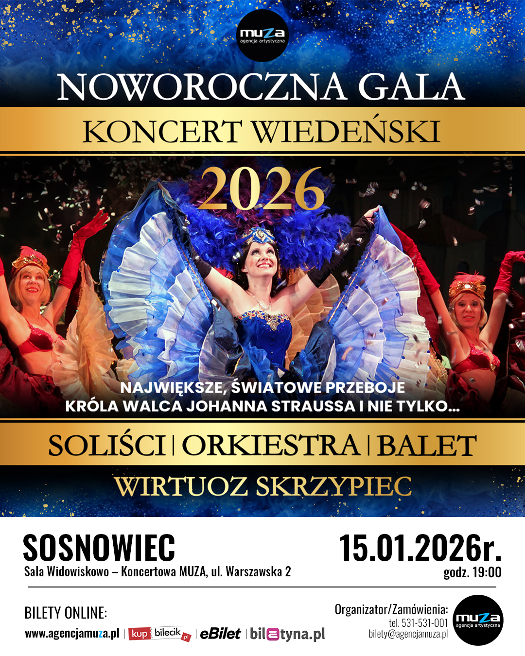 Mamy zaszczyt zaprosić Państwa w niezwykłą podróż po świecie muzyki – od romantycznego Wiednia, gdzie zatrzymamy się w świecie operetki i wysłuchamy najpiękniejszych utworów króla walca Johanna Straussa, po największe przeboje musicali pełnych broadwayowskiego kolorytu. Jest to kolejna edycja znanych i cenionych koncertów noworocznych organizowanych w całej Polsce od lat przez Agencję Artystyczną MUZA.