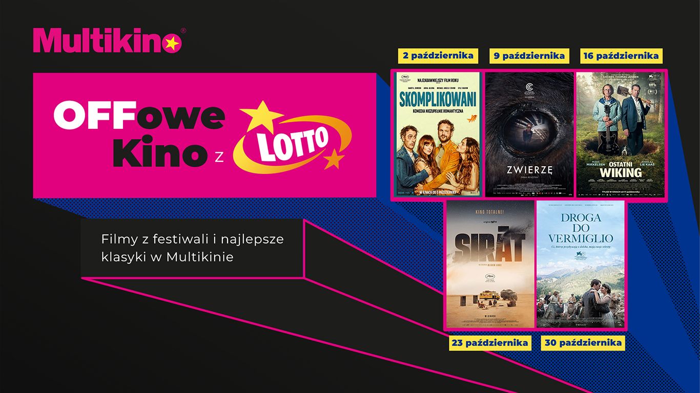 Projekt „OFFowe Kino z Lotto” w październiku ponownie wzbogaci regularny repertuar o filmy festiwalowe i artystyczne produkcje. 2 października we wszystkich kinach sieci Multikino będzie można zobaczyć „Skomplikowanych”, 9 października „Zwierzę”, 16 października „Ostatniego wikinga”, 23 października „Sirat”, a 30 października „Drogę do Vermiglio”.