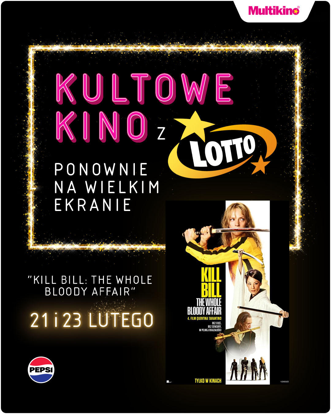 Pod koniec lutego Multikino zaprasza widzów na prawdziwe filmowe wydarzenie. W ramach cyklu Kultowe Kino z Lotto na wielkie ekrany powróci niekwestionowany hit, który zna każdy miłośnik kina - „Kill Bill: The Whole Bloody Affair”. Seanse odbędą się 21 i 23 lutego.