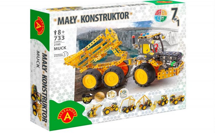 Każdy model składa się z elementów metalowych o różnej wielkości i kształtach, a także jest wzbogacony kolorowymi elementami z tworzyw sztucznych. Dzięki dołączonemu zestawowi narzędzi, można zbudować wyjątkowy pojazd zgodnie ze wskazaniami instrukcji lub wedle własnej wyobraźni. Model po złożeniu jest trwały i może służyć do dalszej zabawy. To idealny wstęp do rozbudzenia w dziecku pasji inżyniera. Zabawka, która łączy pokolenia, zachęcając do wspólnego majsterkowania. Seria 7 w 1 gwarantuje jeszcze więcej zabawy. Sprawdź, jak z tych samych elementów zbudować całkowicie inne maszyny.