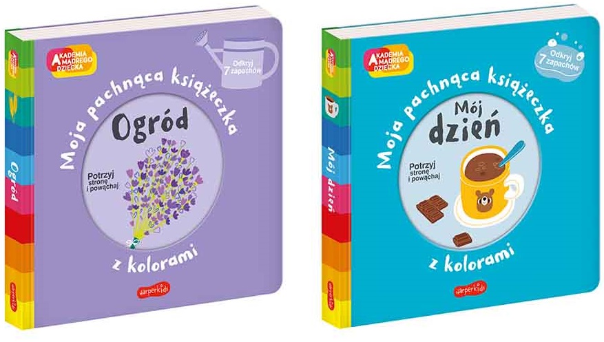 To nowa seria książeczek przeznaczona dla najmłodszych. Na każdej stronie maluch uczy się nowych kolorów, poznaje rzeczy powiązane z daną barwą oraz dzięki potarciu paluszkiem o stronę poznaje zapachy. Piękne kolorowe ilustracje sprawiają, że dzieci z przyjemnością odkrywają świat wokół siebie i chętnie się uczą.