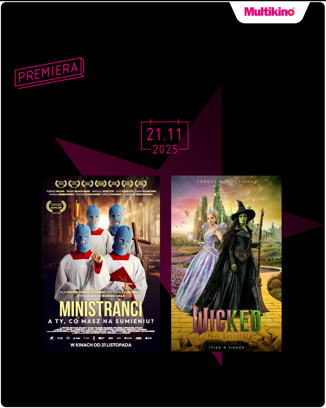 Od 21 listopada na widzów w kinach sieci Multikino będzie czekała druga część musicalu „Wicked: Na dobre” z Arianą Grande, film „Ministranci” balansujący między dramatem a czarnym humorem oraz „Rocznica” - pierwszy zrealizowany w Hollywood film Jana Komasy. Szczegółowy repertuar jest dostępny na stronie www.multikino.pl.