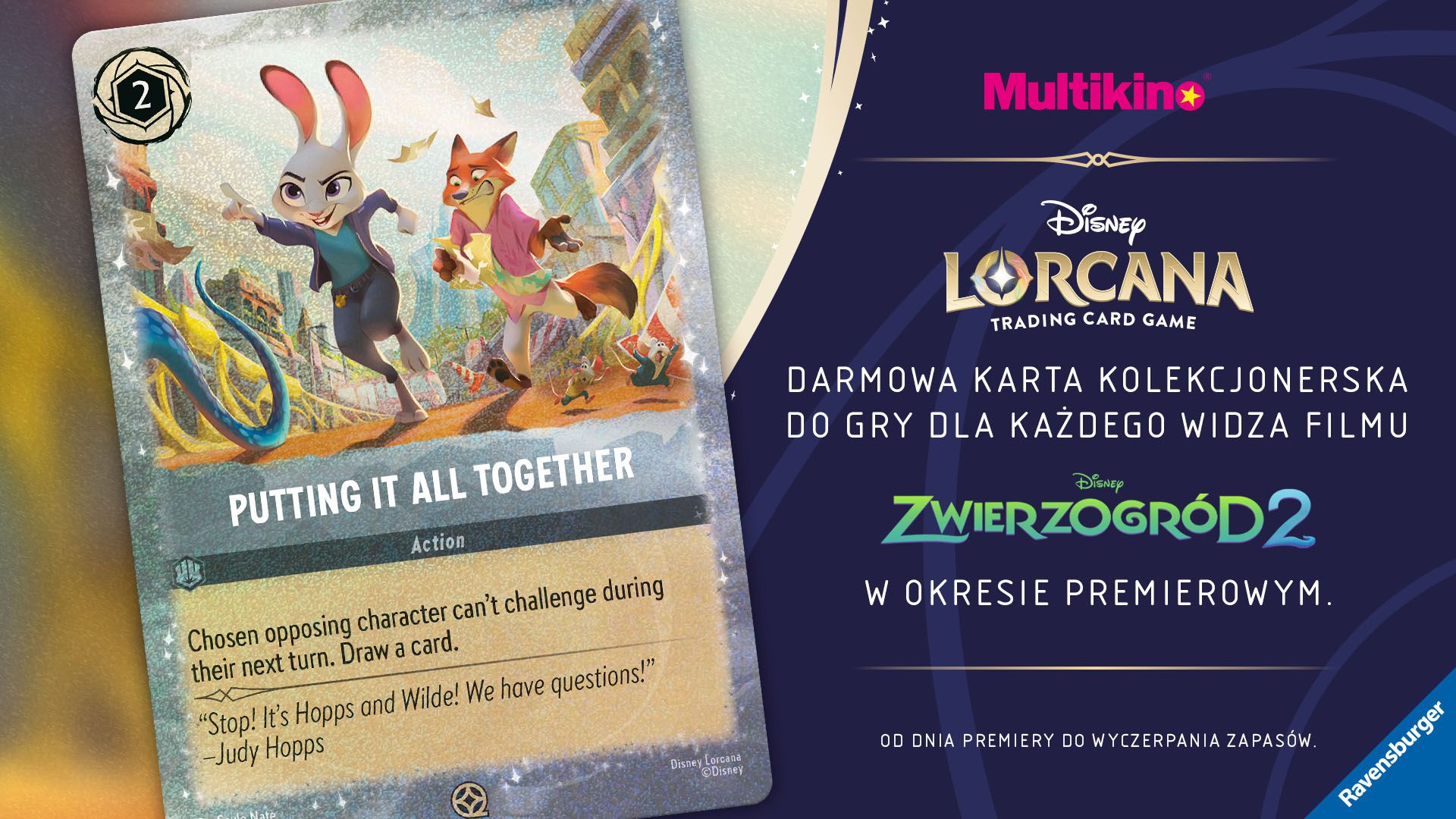 Od 26 listopada we wszystkich kinach sieci Multikino będzie można oglądać animację Disney’a „Zwierzogród 2”. Osoby, które odwiedzą Multikino między środą a niedzielą (26 -30.11) do biletu będą mogły otrzymać kolekcjonerską kartą Zwierzogród z Disney Lorcana. Szczegółowy repertuar jest dostępny na stronie www.multikino.pl