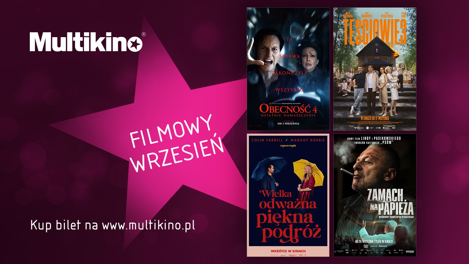 Wrzesień to doskonała okazja, żeby nadrobić w kinie wakacyjne zaległości lub wybrać się na najnowsze premiery filmowe. Wśród nowości widzowie znajdą w repertuarze między innymi: horror „Obecność 4: Ostatnie namaszczenie”, komedię „Teściowie 3”, produkcję obyczajową „Wielka, odważna, piękna podróż” oraz polski film sensacyjny „Zamach na papieża”. Szczegółowy repertuar jest dostępny na stronie www.multikino.pl.