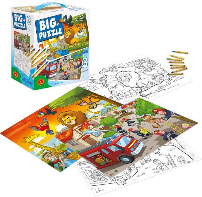 Pudełko zawiera 2 układanki (puzzle) o wymiarach 67/47 cm. Po jednej stronie każdej układanki znajduje się kolorowy obrazek do złożenia. Po drugiej stronie znajduje się konturowy rysunek do złożenia i kolorowania. Kolorowe puzzle są jednocześnie wzorem do rysowania (lub malowania) puzzli czarno – białych. Produkt zawiera kredki.